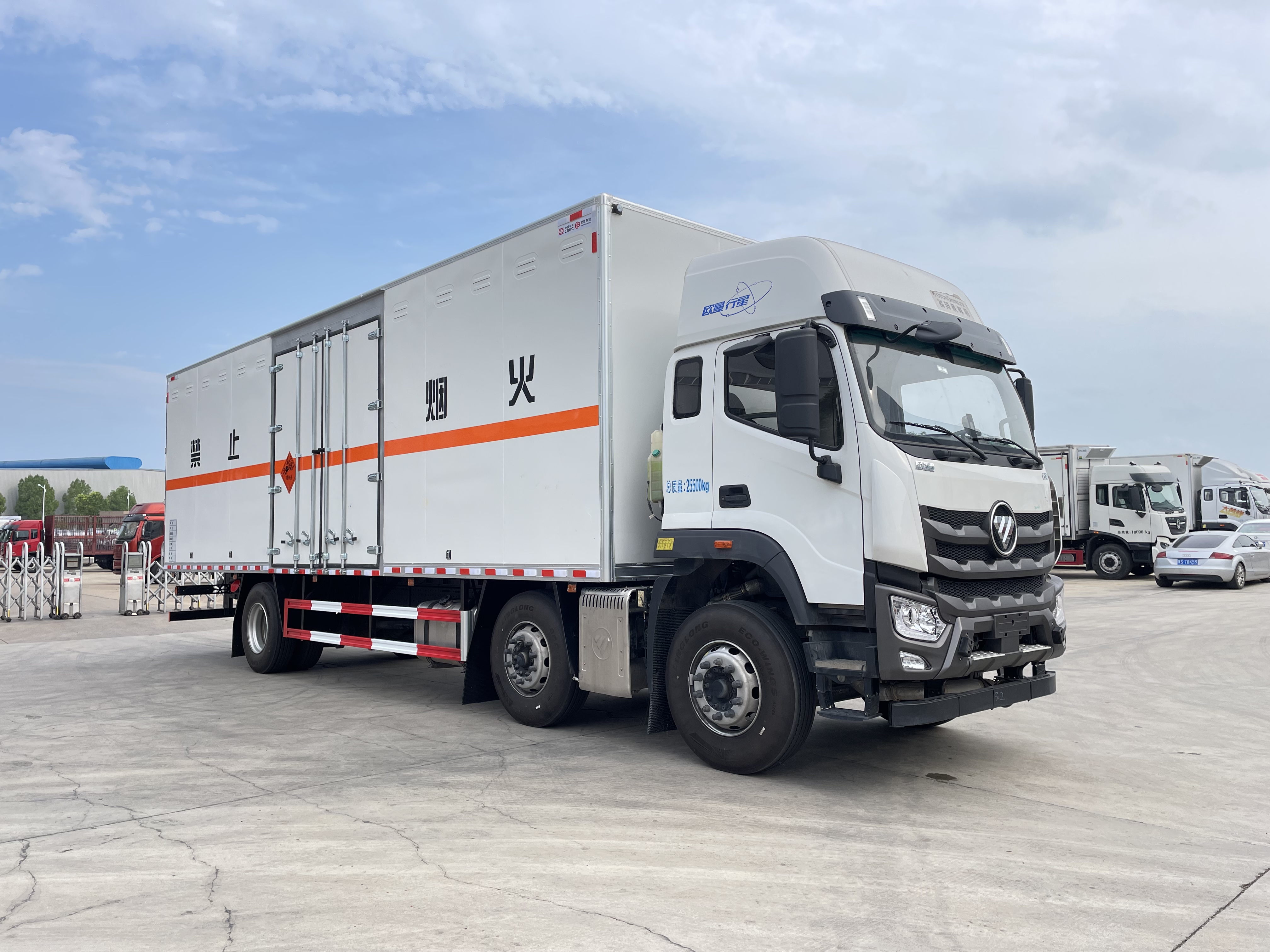 廂體配置:嚴(yán)格按照公告尺寸制作。外板采用烤漆板帶百葉窗,內(nèi)飾為導(dǎo)電性能良好的鋁平板有透氣孔,矩形骨架結(jié)構(gòu)內(nèi)部填充防火阻燃材料,復(fù)合加鉚合工藝。廂體四周鋁合金包邊及包角,車廂底板3mm鋪設(shè)防靜電膠皮,廂體前臉50公分高鋪設(shè)防靜電膠皮。后部設(shè)置對(duì)開門,右側(cè)單開門,廂體內(nèi)部?jī)蓚?cè)安裝捆綁貨物的臥環(huán)。廂體內(nèi)部安裝煙霧報(bào)**器及防盜報(bào)**感應(yīng)器。車廂一周粘貼橙色反光帶,箱體粘貼 菱形標(biāo)志牌,安全告示牌,危險(xiǎn)品牌,箱體安裝示廓燈(前白后紅),拖地靜電帶。